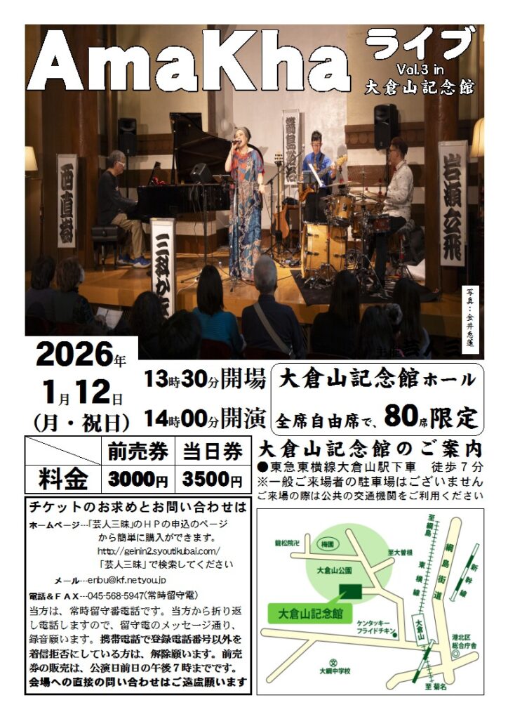 | 1/12(月祝)はAmaKha@大倉山記念館。3度目の出演になります。 記念館は大倉山公園の中にあり,晴れればお散歩にもめっちゃ良いロケーションなのですが,駅から会場までのアクセスが結構な上り坂でして,歩きやすい靴でないと結構厳しいかも知れません。徒歩7分とありますが,時間に余裕を持ってお越しください。 AmaKha的にも久々,半年ぶりのバンドライブです。ご予約はこちら(会場へのご連絡では予約できません)! |